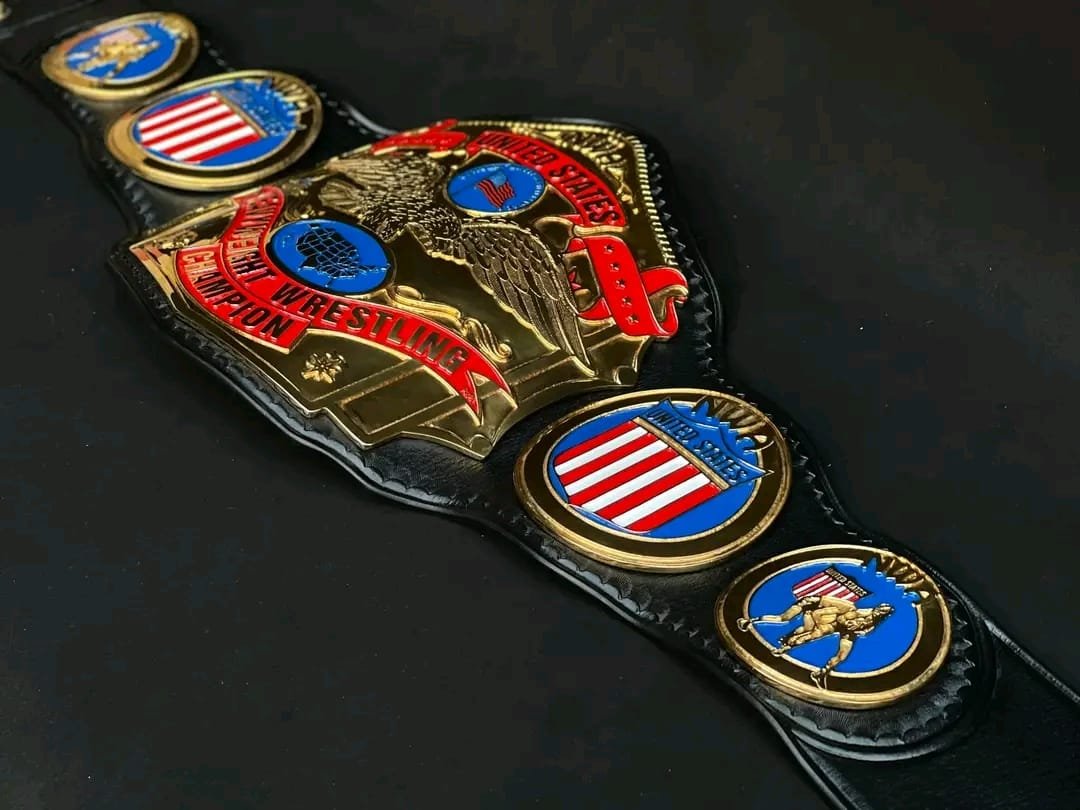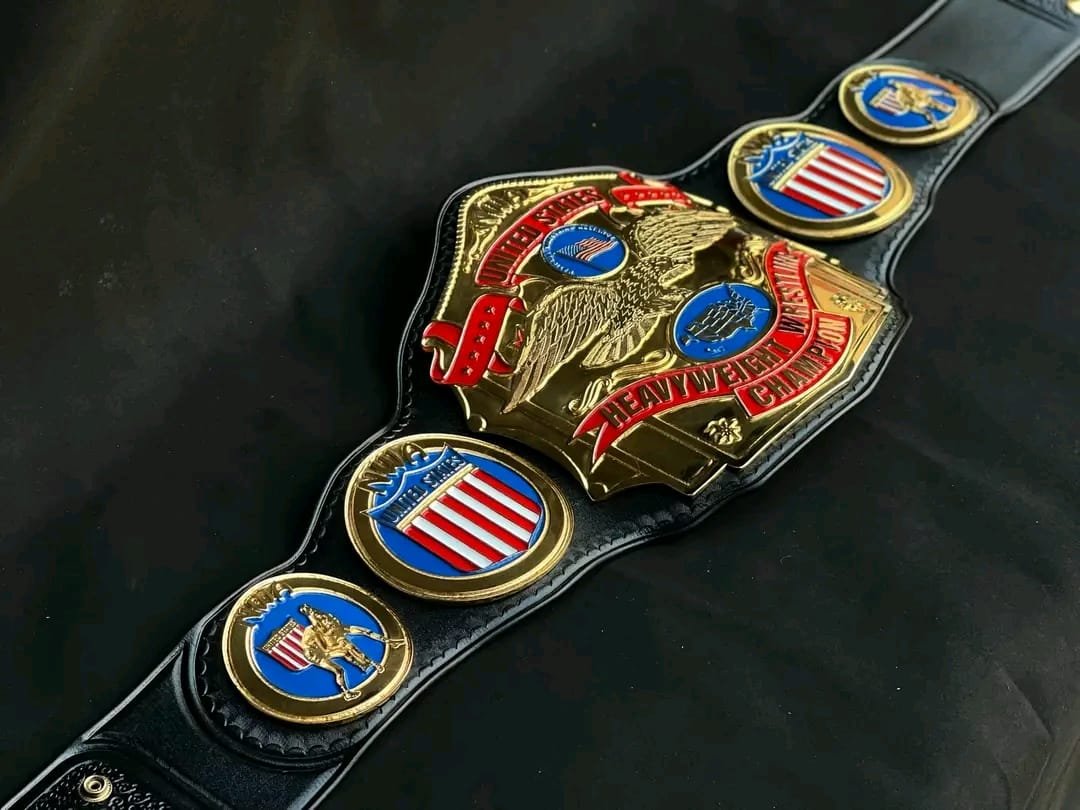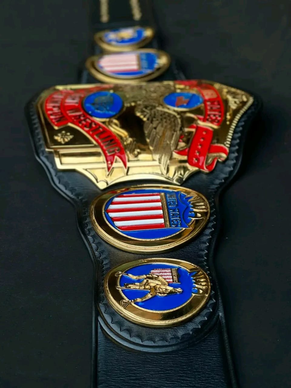 The side plates display patriotic shield and wrestler designs, finished with polished gold plating and colorful enamel accents for a striking visual impact. Mounted on a sturdy black leather strap, the belt is designed for long-lasting use, comfortable wear, and professional presentation.