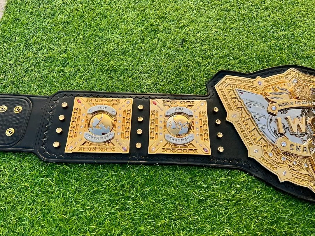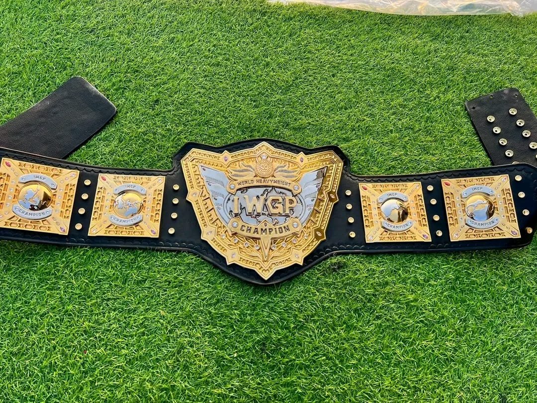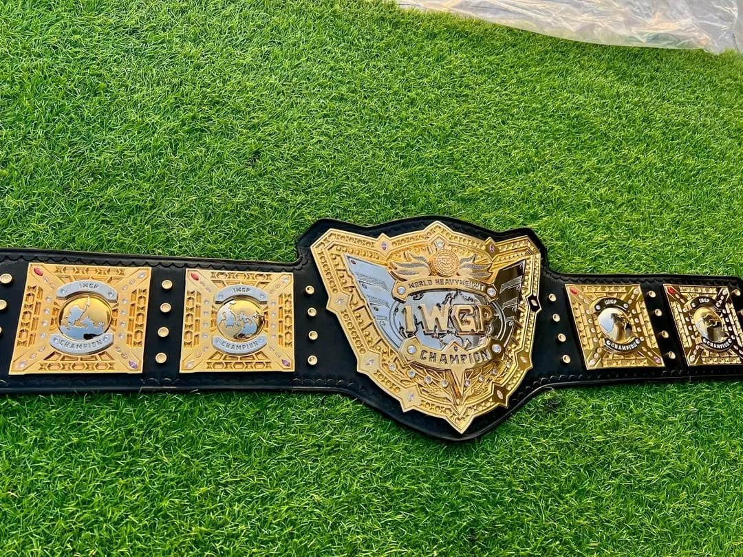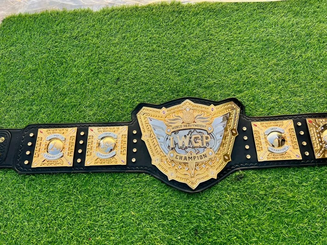 This IWGP Heavyweight Wrestling Championship Belt features an impressive gold-plated design with finely detailed plates mounted on a durable black leather strap. The large center plate displays the iconic IWGP Champion branding, surrounded by intricate patterns that enhance its prestigious appearance.