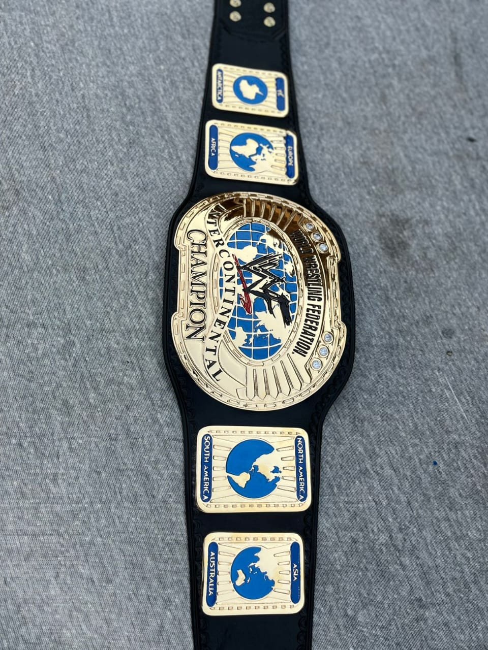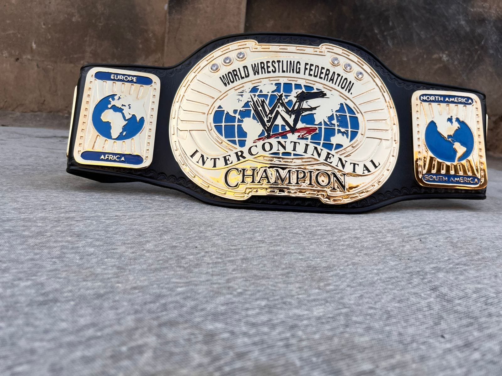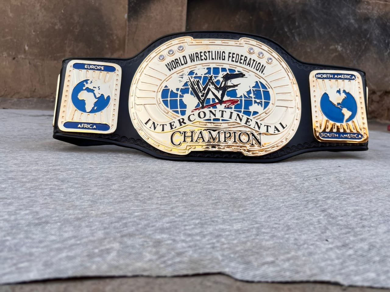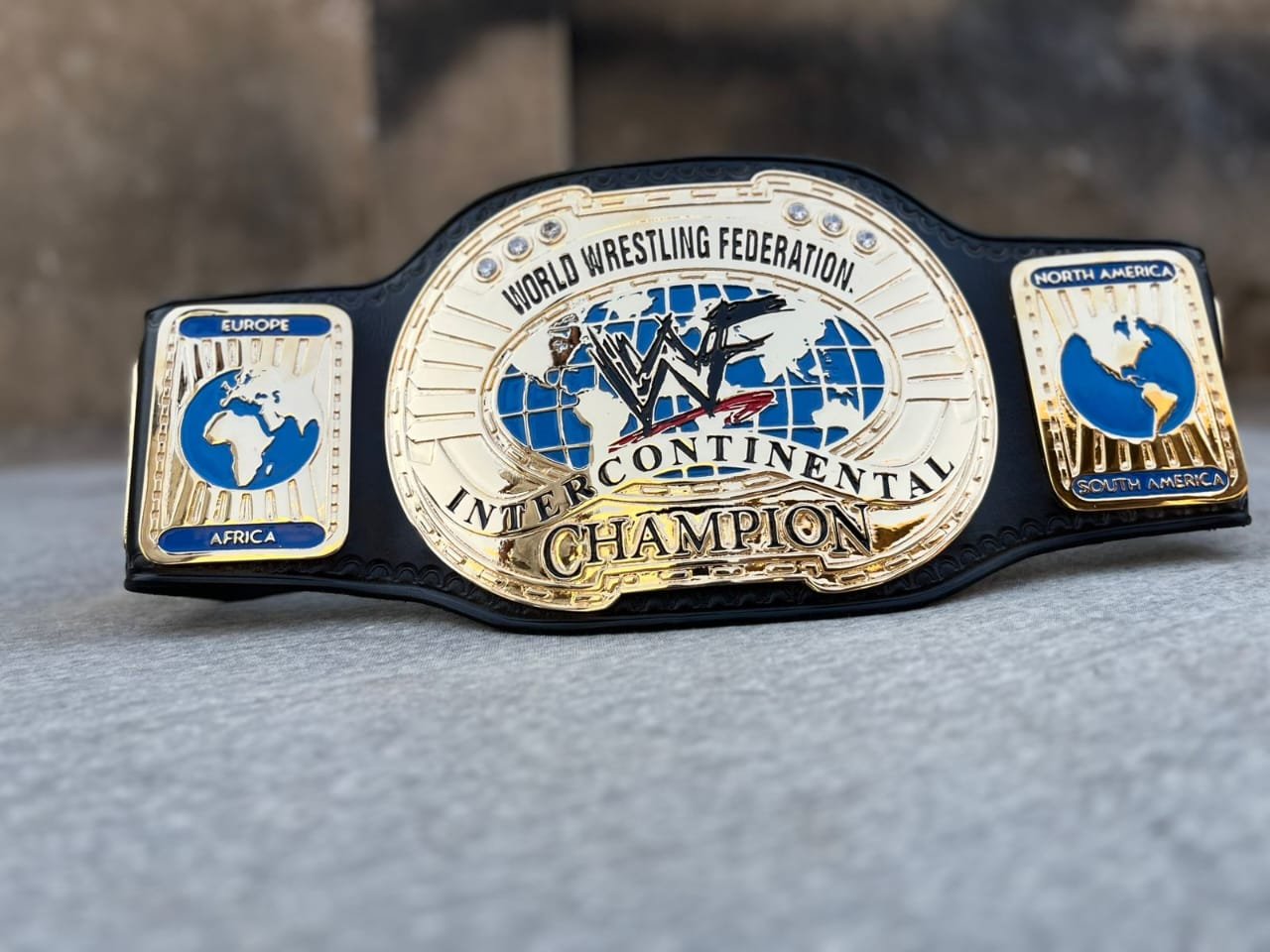 On either side of the main plate are detailed side plates representing different regions of the world, including Europe, Africa, North America, and South America, reinforcing the global nature of the championship. The combination of gold, blue, and black gives the belt a classic and authoritative appearance. Resting on a neutral surface, the belt represents honor, achievement, and the legacy of legendary wrestlers who have held the Intercontinental Championship throughout WWF history.