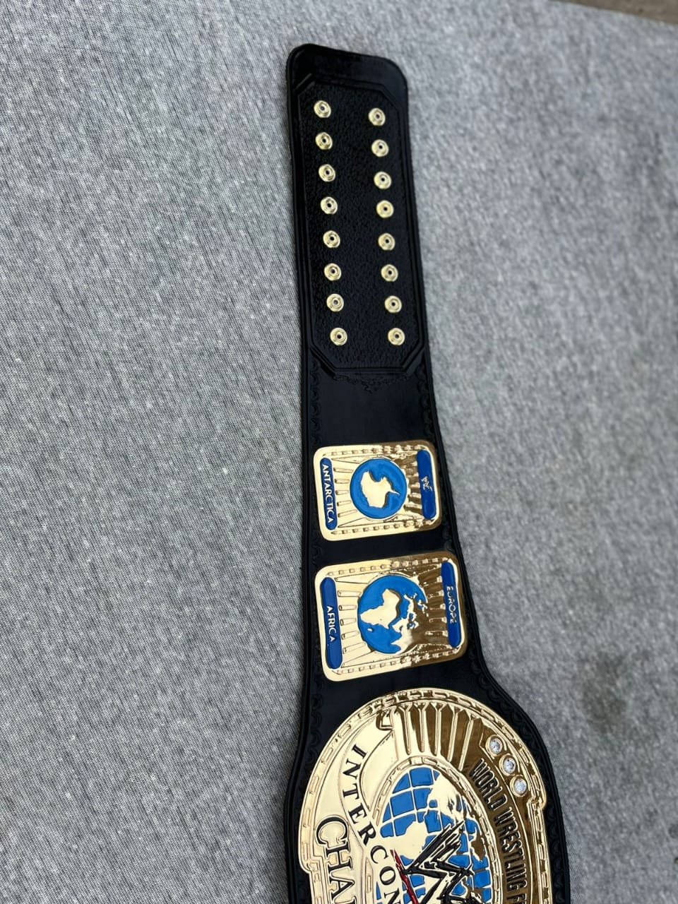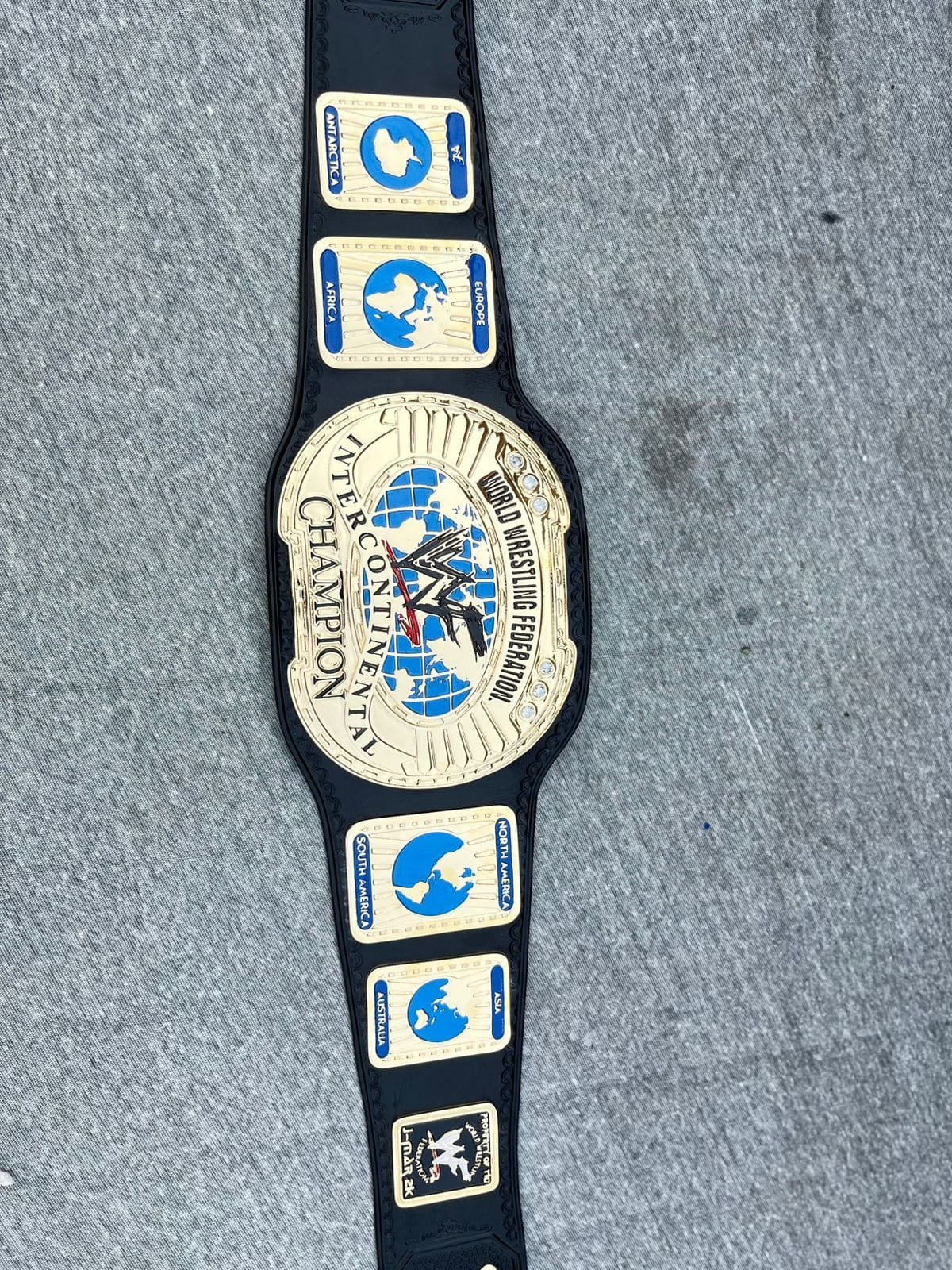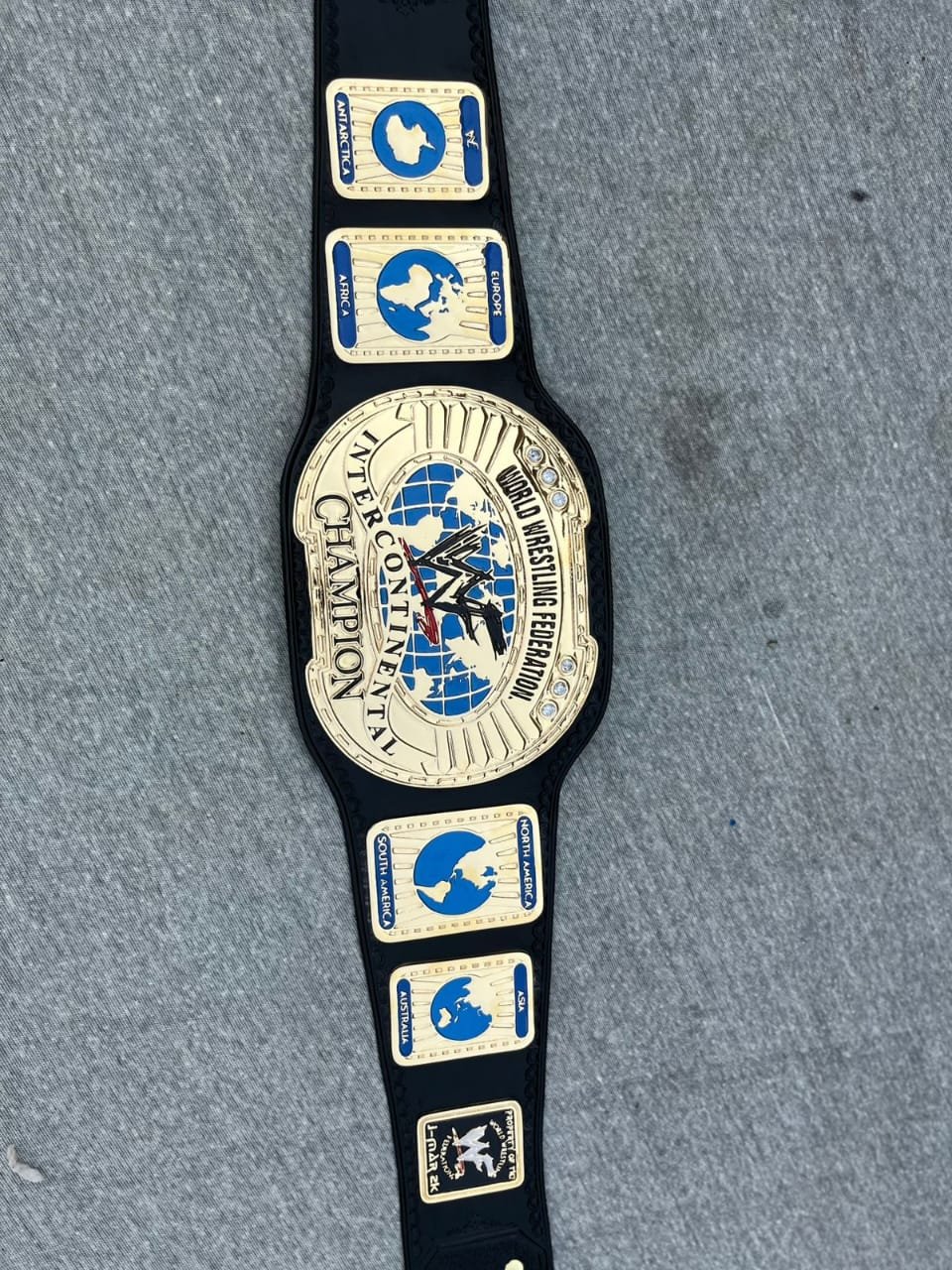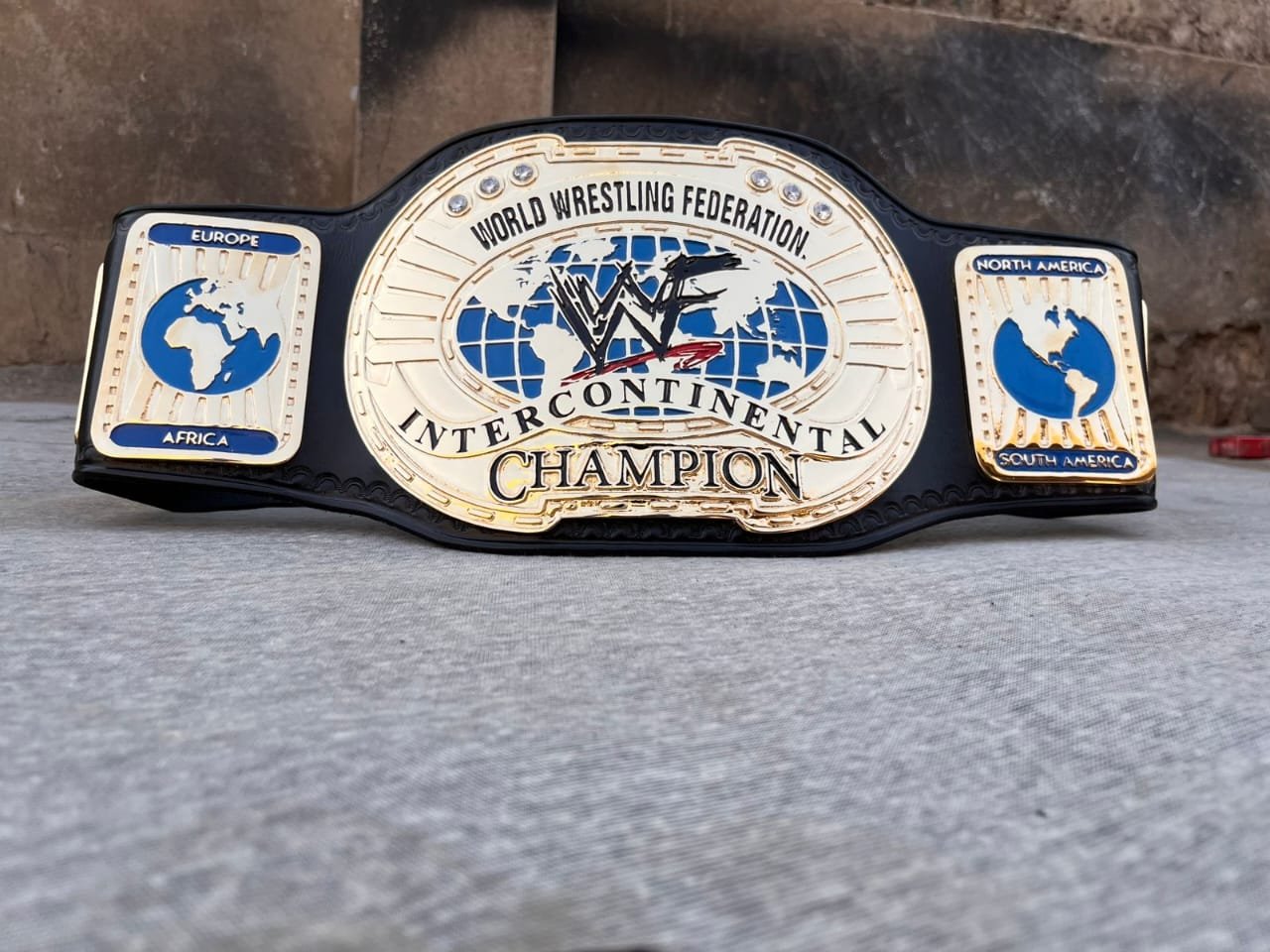 On either side of the main plate are detailed side plates representing different regions of the world, including Europe, Africa, North America, and South America, reinforcing the global nature of the championship. The combination of gold, blue, and black gives the belt a classic and authoritative appearance. Resting on a neutral surface, the belt represents honor, achievement, and the legacy of legendary wrestlers who have held the Intercontinental Championship throughout WWF history.