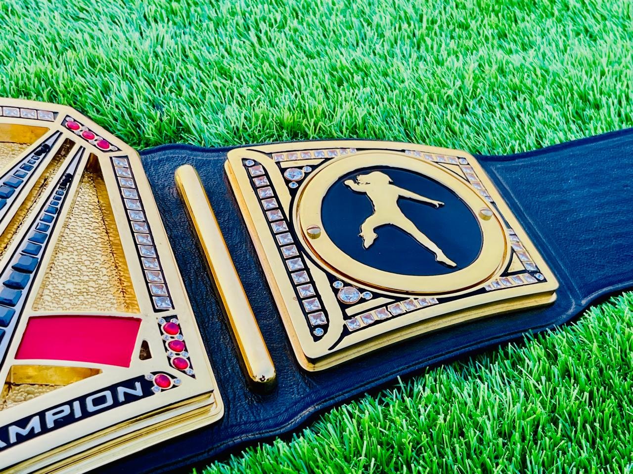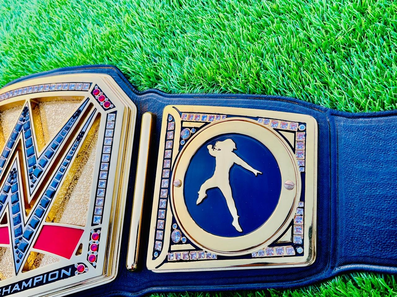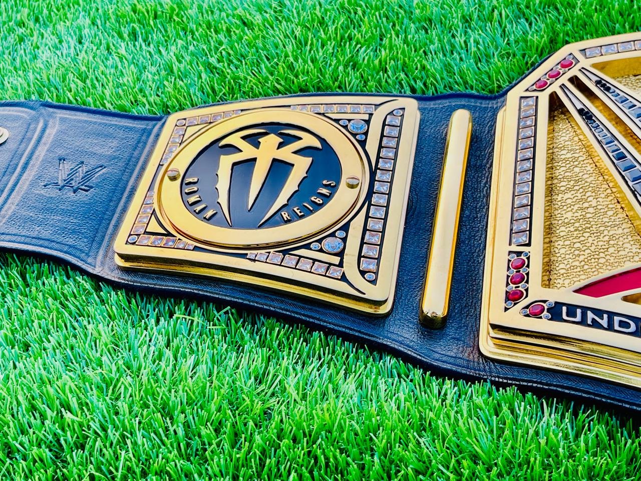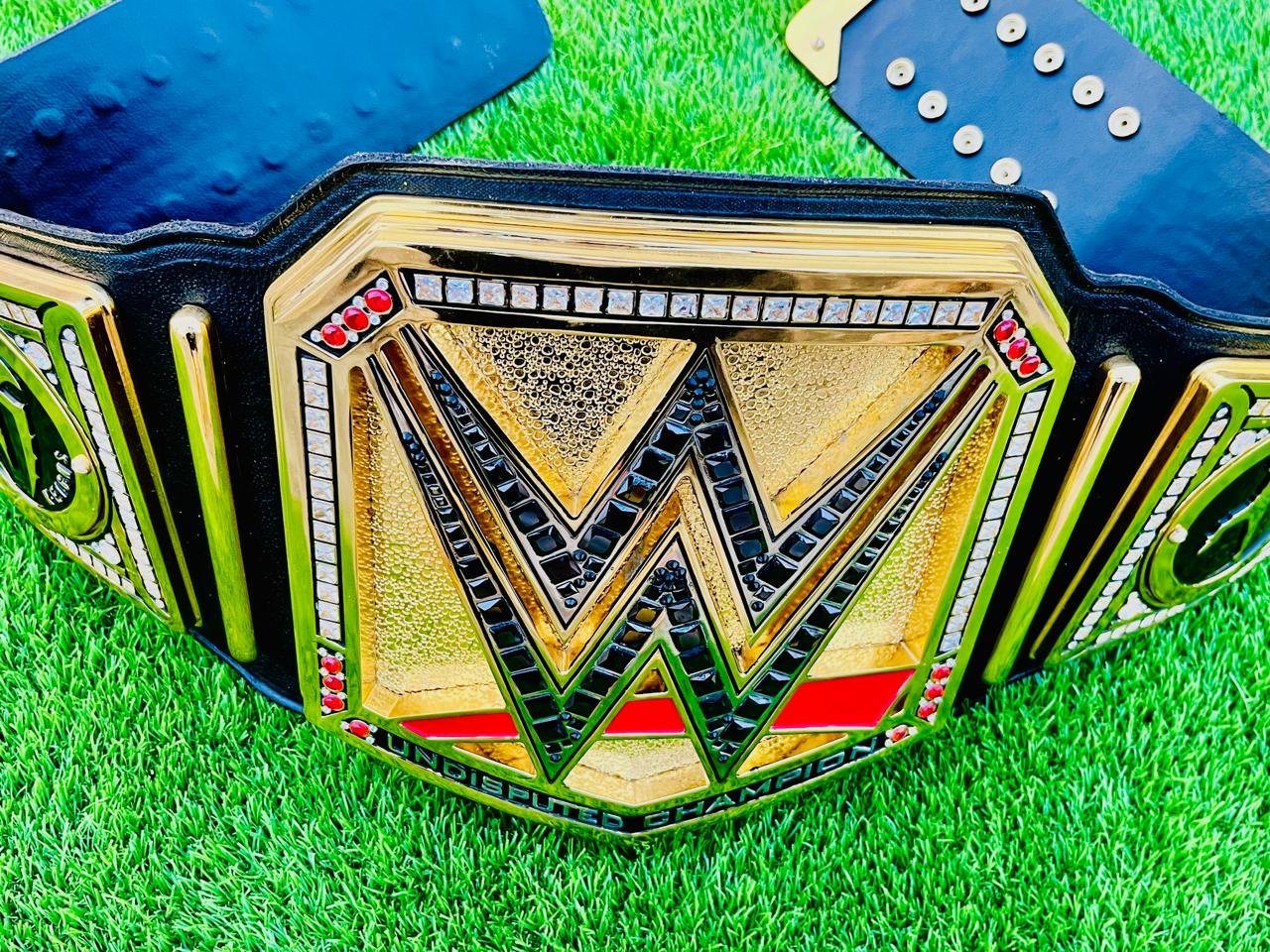 Each plate is coated in 24K real gold plating, delivering a mirror-like finish that resists fading and adds a premium shine. The center plate displays the iconic WWE logo, surrounded by dozens of individually hand-set original CZ stones, matching the brilliance of real diamonds.